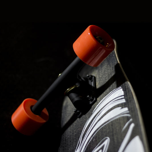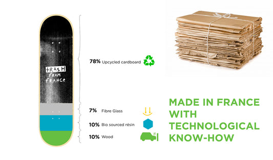 Trashboard rassemble et réutilise d'anciennes pièces ou du carbone résiduel, les mélangeant avec du carton à usage unique pour produire un skateboard distinctif, léger et très durable. -